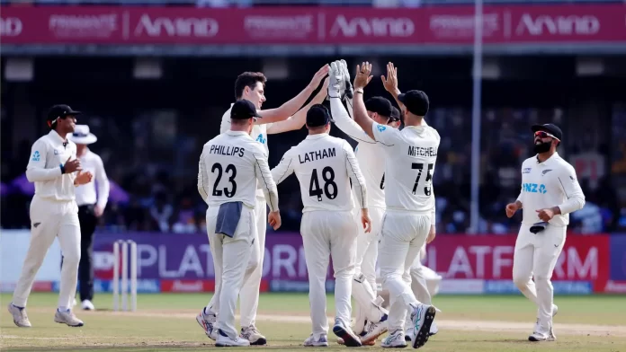 A fiery spell with the second new ball from New Zealand’s fast bowlers sparked a dramatic collapse, sending India from a commanding 408/3 to 462 all out. With Sarfaraz Khan (150) and Rishabh Pant (99) in full flow, India had a prime opportunity to extend their lead and take control of the match. However, the visitors turned the game around by applying relentless pressure with the second new ball, refusing to let India regain their footing. New Zealand now need just 107 runs to claim a memorable victory and take a 1-0 lead in the series.