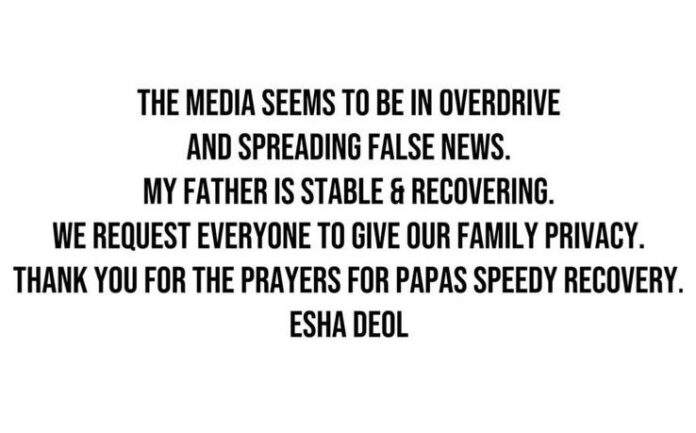 Esha Deol, through an official statement, said, “Papa is absolutely fine and recovering well. Kindly do not believe or circulate any false news regarding his health.” She added that the family is thankful for the fans’ constant love and concern.