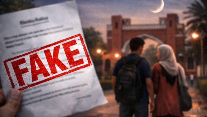 New Delhi: A sensational notification supposedly issued by the administration of Jamia Millia Islamia (JMI) has set social media ablaze this week.The document, which carries the university’s official letterhead, claims that any boy and girl found standing together on campus durin