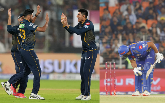 The GT pacer bowled a good-length delivery, slightly wide off the off stump, which seamed back in sharply after pitching. With no foot movement, Rohit attempted a defensive block, but the ball snuck between bat and pad, crashing into the top of the off stump—a big breakthrough for GT.