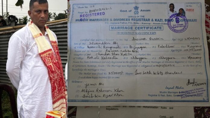 Guwahati (Assam ) 6 September -A storm of allegations has engulfed Chaygaon in Assam, where Congress councillor Anwar Hussain, elected from the Palashbari constituency, is accused of systematically cheating a grieving Hindu family, looting their savings and insurance, and staging an illegal interfaith marriage with their daughter under a kazi, despite already being married himself. The case exposes not just personal betrayal but also a glaring failure of law enforcement.