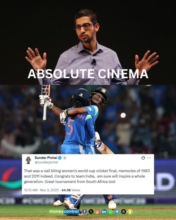 Google CEO Sundar Pichai joined millions of cricket fans in celebrating India’s landmark victory at the 2025 ICC Women’s ODI World Cup. In a heartfelt message shared on social media, the Indian-born tech leader hailed the team’s triumph as a “nail-biting final” reminiscent of India’s iconic World Cup wins in 1983 and 2011.